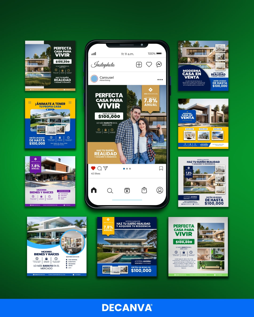 ¡Lleva tus estrategias de marketing inmobiliario al siguiente nivel! Nuestra colección de 100 plantillas editables para bienes raíces en Canva está diseñada para que destaques en el competitivo mercado inmobiliario sin complicaciones.